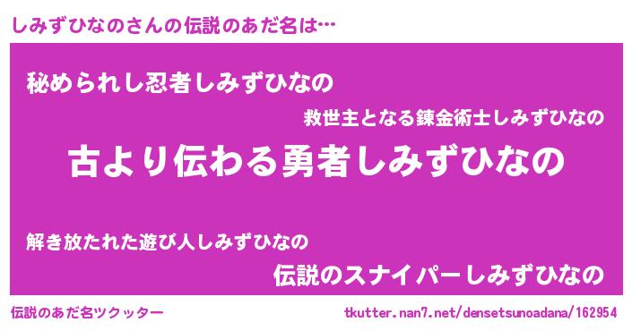 | 男性向けラノベタイトル風あだ名 | 『しみずひなのという概念が存在しない退屈な世界 』 |