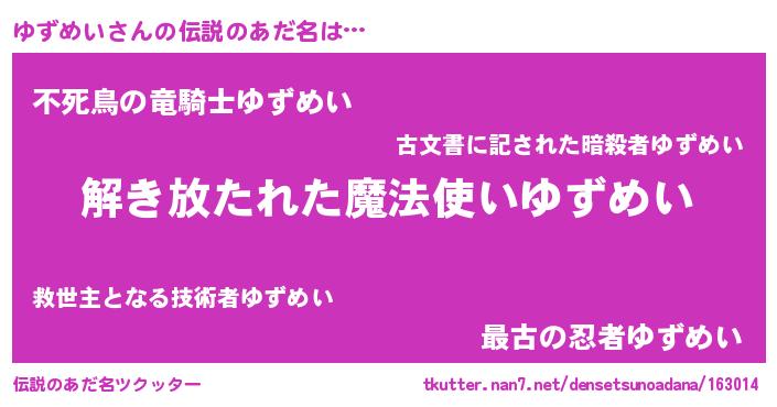 | ヒーロー風カッコイイあだ名 | 『魔戒騎士ユズ』『サイバー戦士ユズメイ』 |