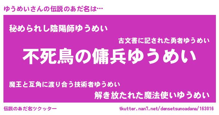 | ファンタジー風あだ名 | 『ユウフェル』『エターナルユウメイー』 |