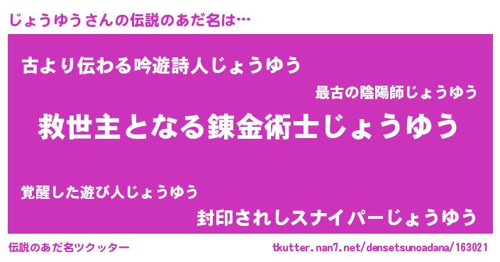 | 男性向けラノベタイトル風あだ名 | 『じょうゆう~年齢イコール彼女いない歴の魔法使い~』 |