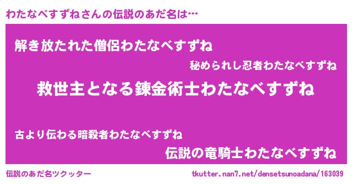 | 男性向けラノベタイトル風あだ名 | 『わたなべすずね~年齢イコール彼女いない歴の魔法使い~』 |