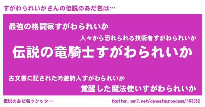 | 胡散臭い通販商品みたいなあだ名 | 『必ず成功するブレスレット…その名も「すがわられいか」』 |