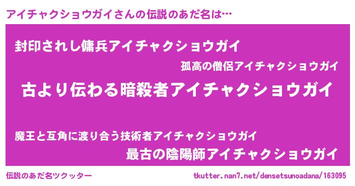 | 意味不明あだ名 | 『自称アイチャクショウガイ』 |