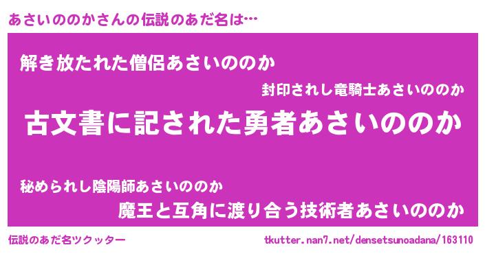 | 女子向けラノベタイトル風あだ名 | 『あさいののかストレイドッグス』 |