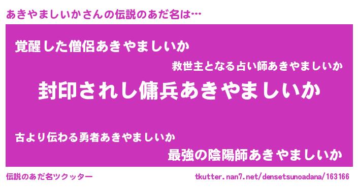| 男性向けラノベタイトル風あだ名 | 『この素晴らしい世界にあきやましいかを!』 |