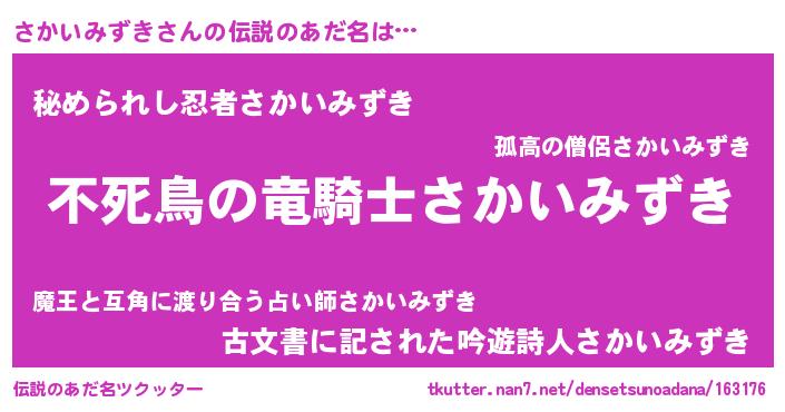 女子向けラノベタイトル風あだ名 | 『さかいみずき姫と円卓の騎士』 |