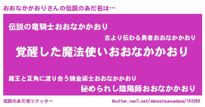 | 男性向けラノベタイトル風あだ名 | 『おおなかかおり~年齢イコール彼女いない歴の魔法使い~』 |