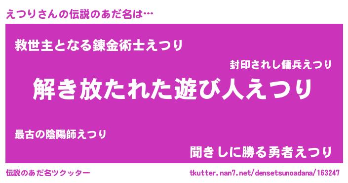 | ヒーロー風カッコイイあだ名 | 『魔戒騎士エツ』『天空の使者えつり』 |
