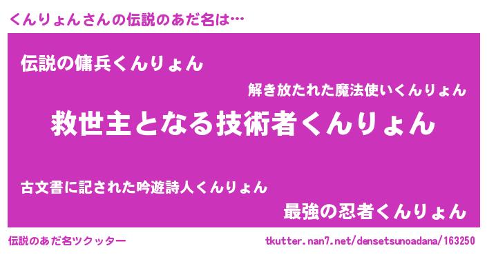 | 男性向けラノベタイトル風あだ名 | 『くんりょん~年齢イコール彼女いない歴の魔法使い~』 |