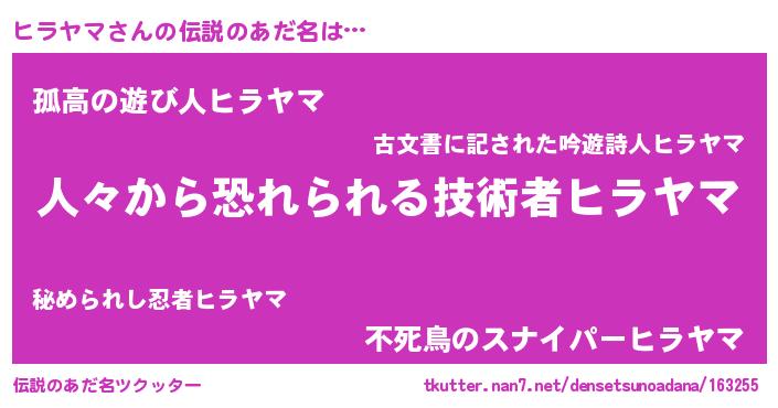 | 男性向けラノベタイトル風あだ名 | 『おまえをオタクにしてやるから、俺をヒラヤマにしてくれ! 』 |