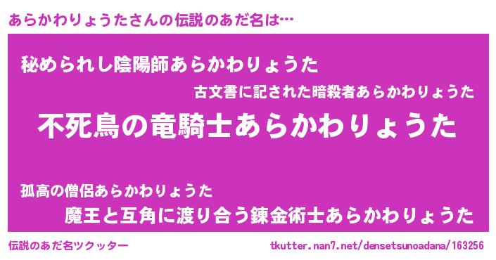 | 男性向けラノベタイトル風あだ名 | 『アラカワリョウタアートオンライン』 |