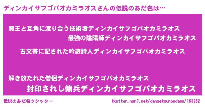 | ヘコむあだ名 | 『ディンカイサフゴパオカミラオス(小並感)』 |