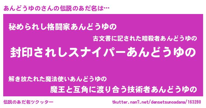 | 男性向けラノベタイトル風あだ名 | 『あんどうゆの~年齢イコール彼女いない歴の魔法使い~』 |