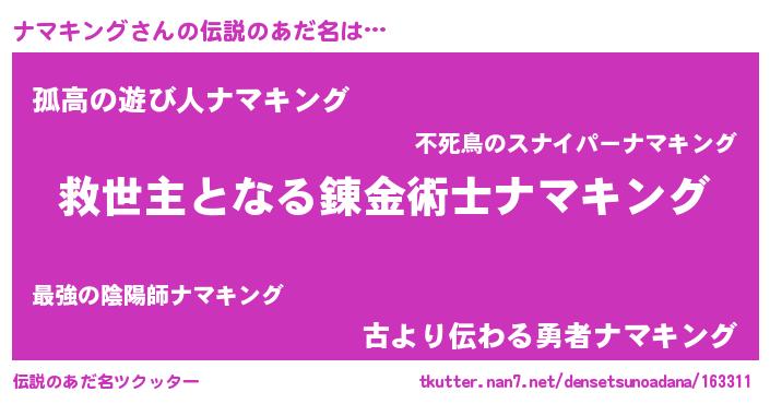 | ヒーロー風カッコイイあだ名 | 『天空の使者ナマキング』『暗黒騎士ナマ』 |