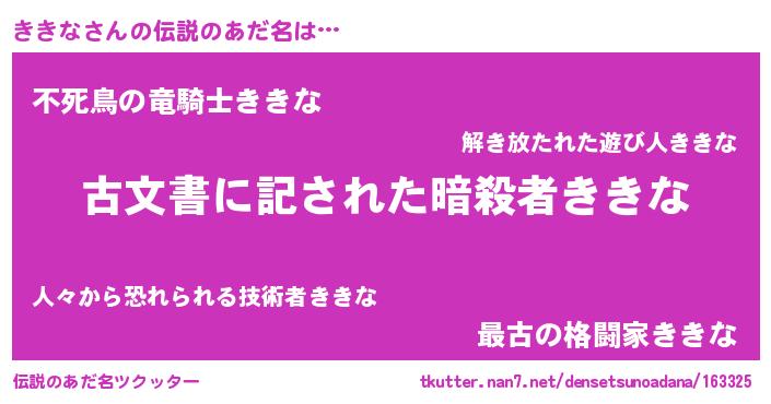 | ヒーロー風カッコイイあだ名 | 『究極戦士キキナ』『仮面キキダー』 |