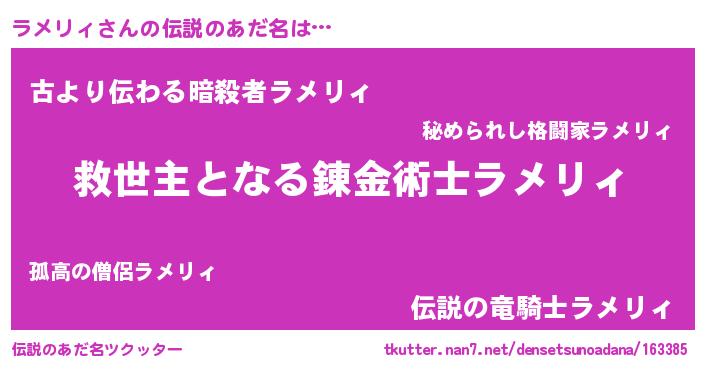 | 男性向けラノベタイトル風あだ名 | 『Re:ラメリィから始める異世界生活』 |