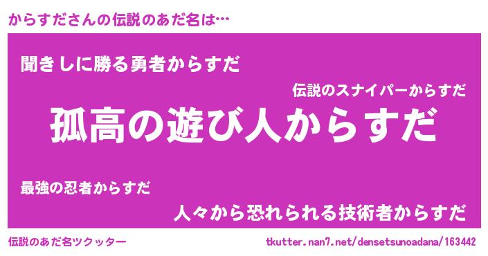 | 意味不明あだ名 | 『自称からすだ』『つくし科からすだ属』 |