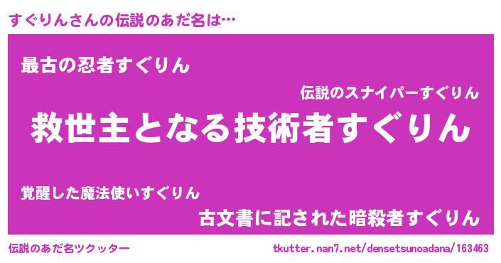 | ヒーロー風カッコイイあだ名 | 『天空の使者すぐりん』『仮面スグダー』 |