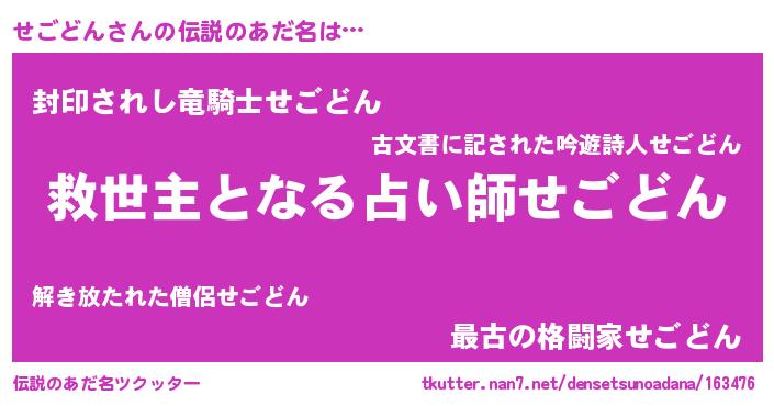 | ヒーロー風カッコイイあだ名 | 『天空の使者せごどん』『ネオセゴドン』 |