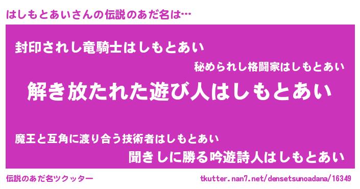 | 男性向けラノベタイトル風あだ名 | 『はしもとあいの嫁は女の子じゃないと思った?』 |
