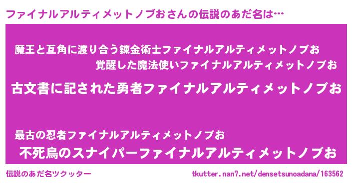 | 男性向けラノベタイトル風あだ名 | 『ファイナルアルティメットノブおに滅ぼされるだけの簡単なお仕事です』 |