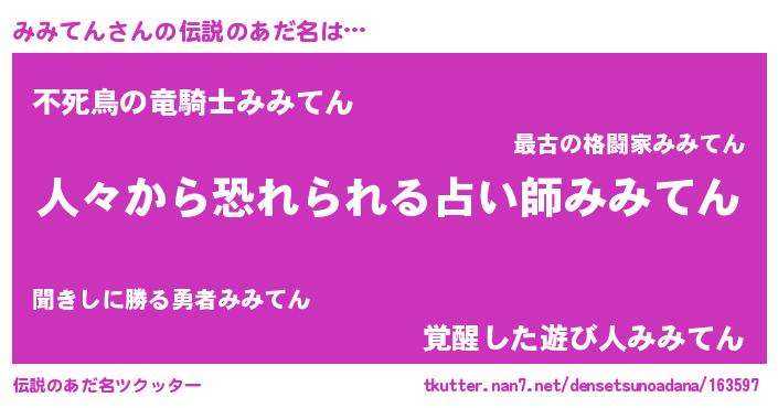| 意味不明あだ名 | 『めかぶ科みみてん属』『自称みみてん』 |