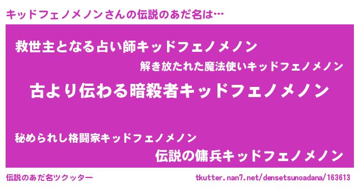 | 意味不明あだ名 | 『永久保存キッドフェノメノン』 |