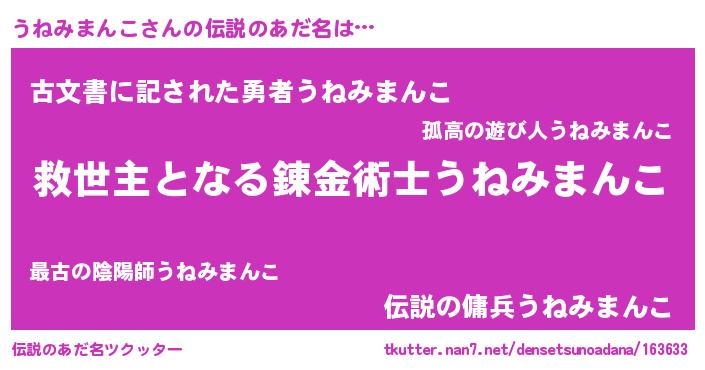 | 胡散臭い通販商品みたいなあだ名 | 『あなたにだけ特別に提供する世界で10本だけ現存している希少なブランデー…その名も「うねみまんこ」』 |