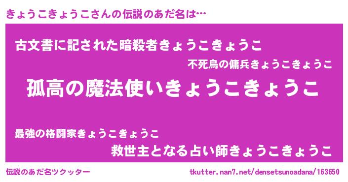 | 意味不明あだ名 | 『とにかく怪しいきょうこきょうこ』 |