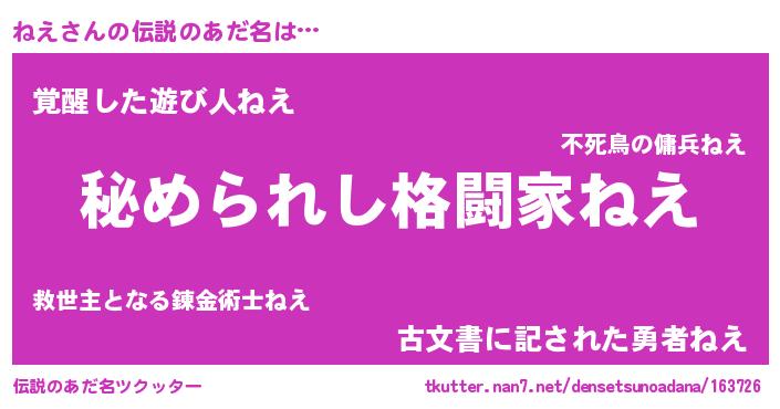 | 女子向けラノベタイトル風あだ名 | 『ねえの雑貨屋さん』『ねえは平凡を望む』 |