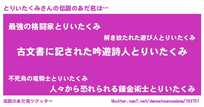| 男性向けラノベタイトル風あだ名 | 『うちのとりいたくみが世界を掌握している!』 |