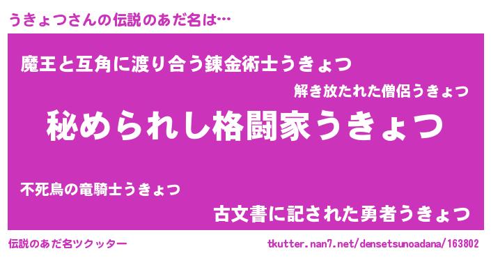 | 女子向けラノベタイトル風あだ名 | 『うきょつの雑貨屋さん』『闇のうきょつ』 |