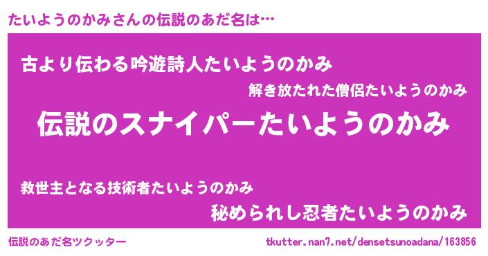 | 男性向けラノベタイトル風あだ名 | 『タイヨウノカミスレイヤー』 |