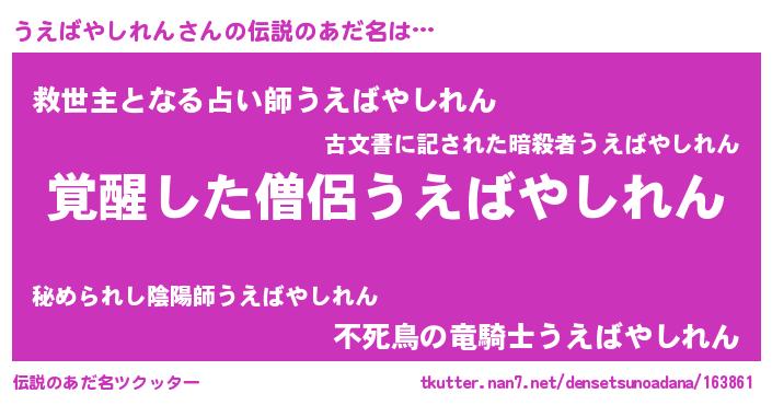 | 男性向けラノベタイトル風あだ名 | 『うえばやしれんに滅ぼされるだけの簡単なお仕事です』 |