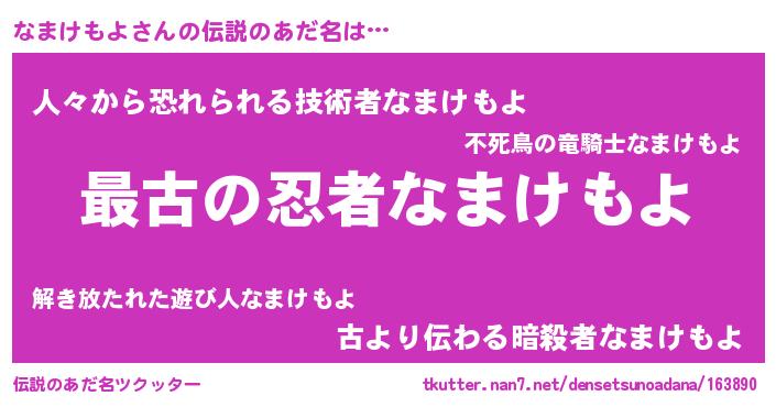 | ファンタジー風あだ名 | 『エターナルナマケモヨー』『ナマフェル』 |