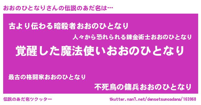 | 男性向けラノベタイトル風あだ名 | 『おおのひとなり~年齢イコール彼女いない歴の魔法使い~』 |