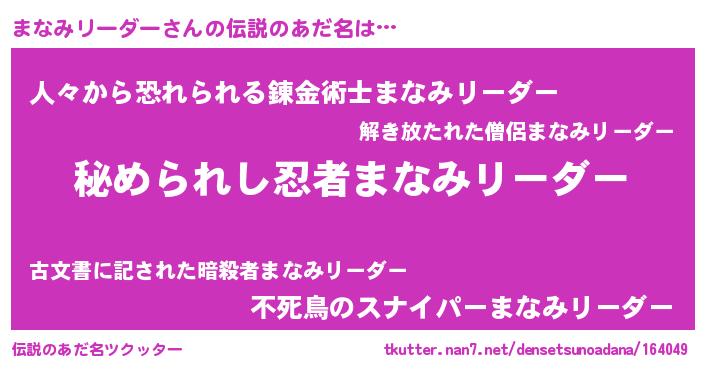 | 男性向けラノベタイトル風あだ名 | 『やはりまなみリーダーの青春ラブコメはまちがっている 』 |