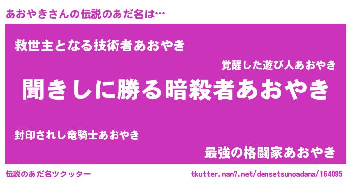 | 男性向けラノベタイトル風あだ名 | 『あおやきという概念が存在しない退屈な世界 』 |