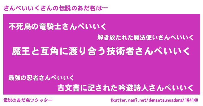 | 男性向けラノベタイトル風あだ名 | 『おまえをオタクにしてやるから、俺をさんぺいいくにしてくれ! 』 |