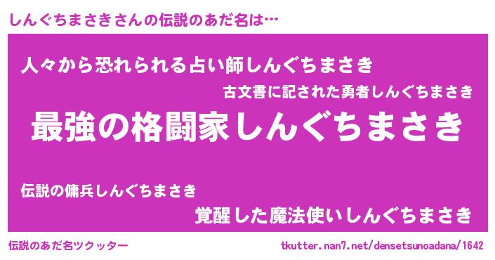 | 男性向けラノベタイトル風あだ名 | 『しんぐちまさき~年齢イコール彼女いない歴の魔法使い~』 |