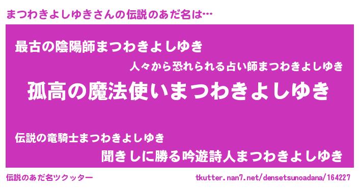 | ポケモン風あだ名 | 『マツセウス』『ヒマツワキヨシユキ』 |