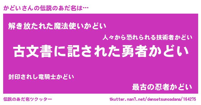 | ヒーロー風カッコイイあだ名 | 『究極戦士カドイ』『ネオカドイ』 |