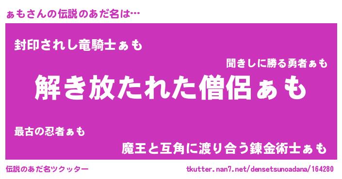 | 男性向けラノベタイトル風あだ名 | 『ぁもの嫁は女の子じゃないと思った?』 |