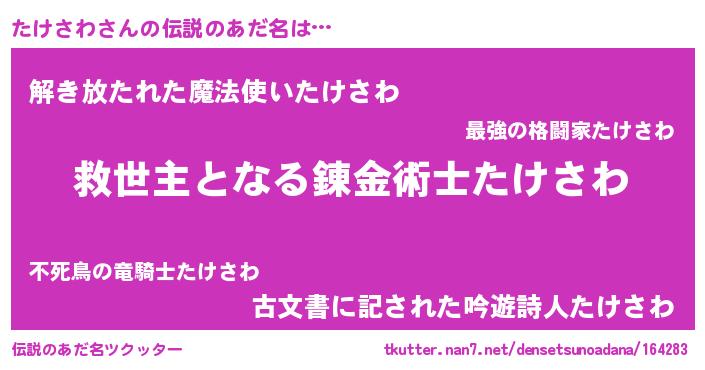 | 男性向けラノベタイトル風あだ名 | 『たけさわに滅ぼされるだけの簡単なお仕事です』 |