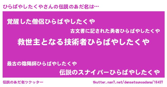 | 肩書あだ名 | 『ひらばやしたくや大佐』 |