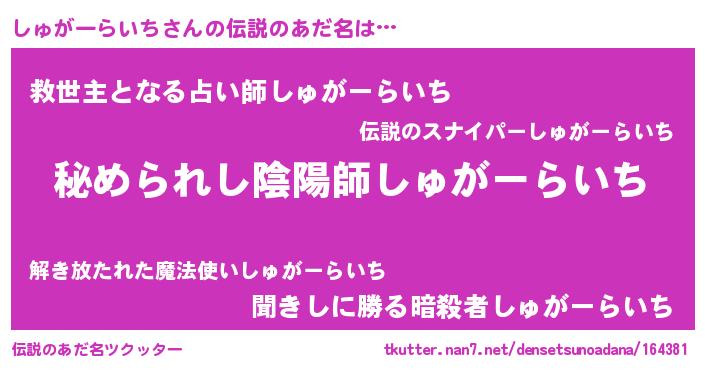 | 意味不明あだ名 | 『住所不定無職しゅがーらいち(81歳)』 |
