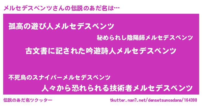 | 男性向けラノベタイトル風あだ名 | 『誰もが恐れるあのメルセデスベンツが、ぼくの専属メイドになるようです。』 |