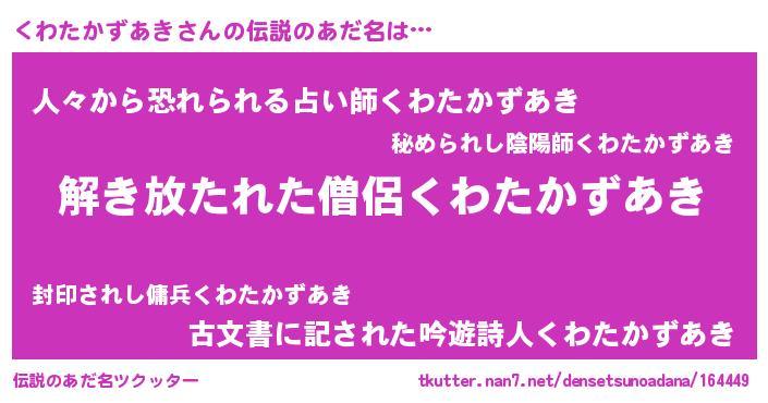 | 男性向けラノベタイトル風あだ名 | 『くわたかずあきの嫁は女の子じゃないと思った?』 |