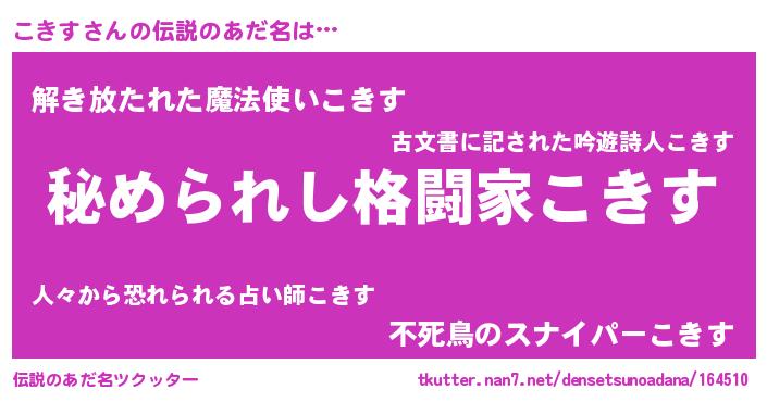 | ヒーロー風カッコイイあだ名 | 『超時空戦士コキス』『銀牙騎士コキ』 |
