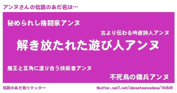 | ヒーロー風カッコイイあだ名 | 『仮面アンダー』『幻影騎士アン』 |